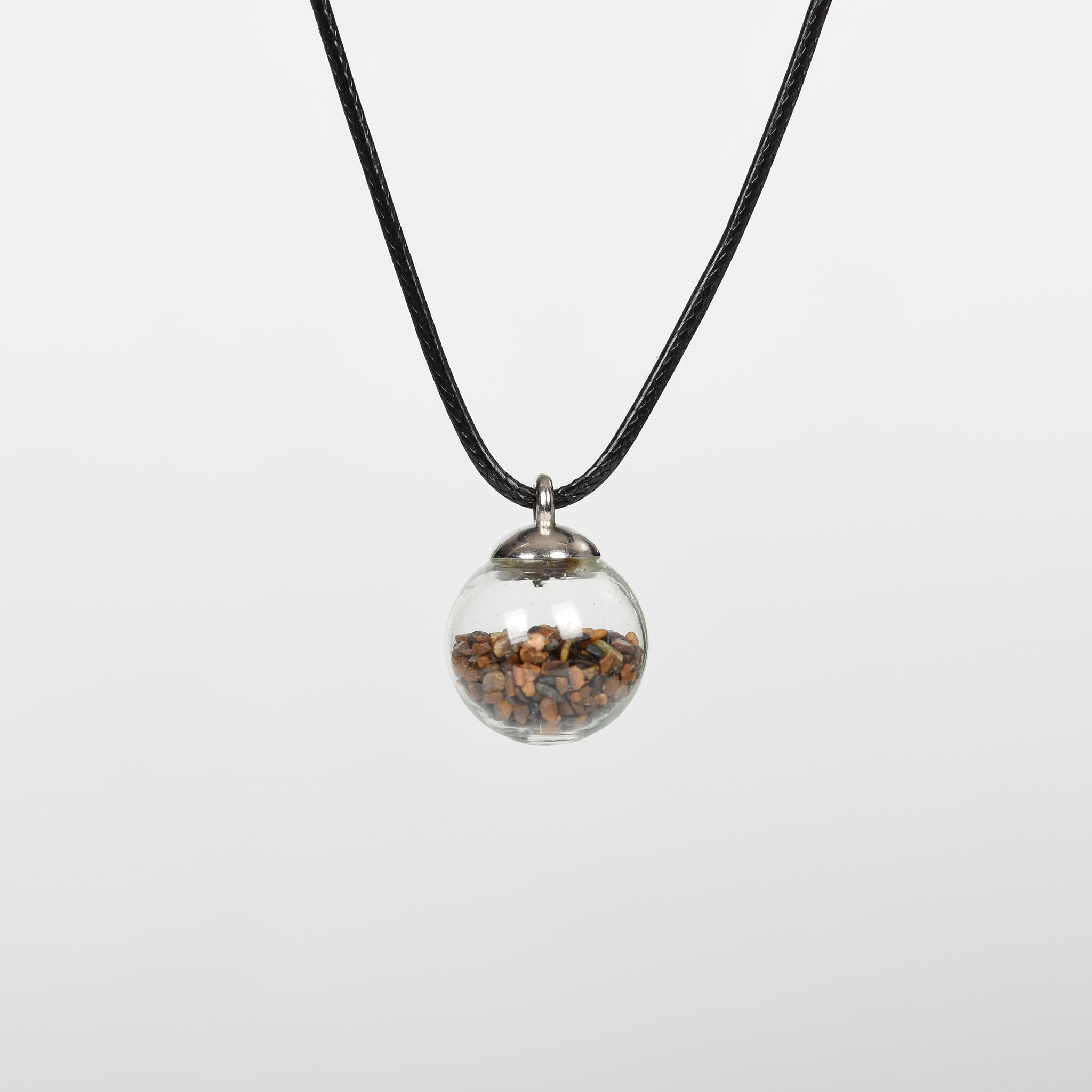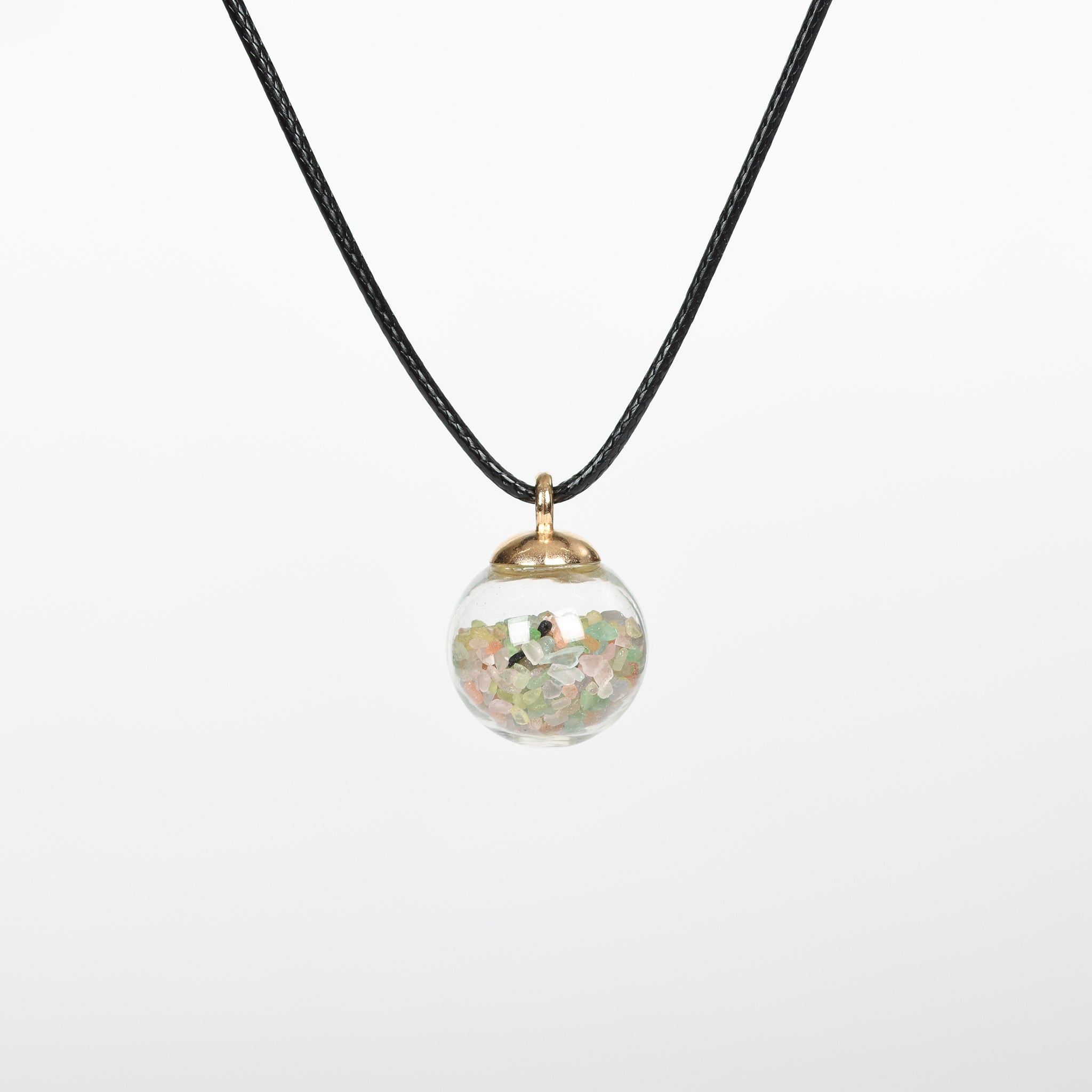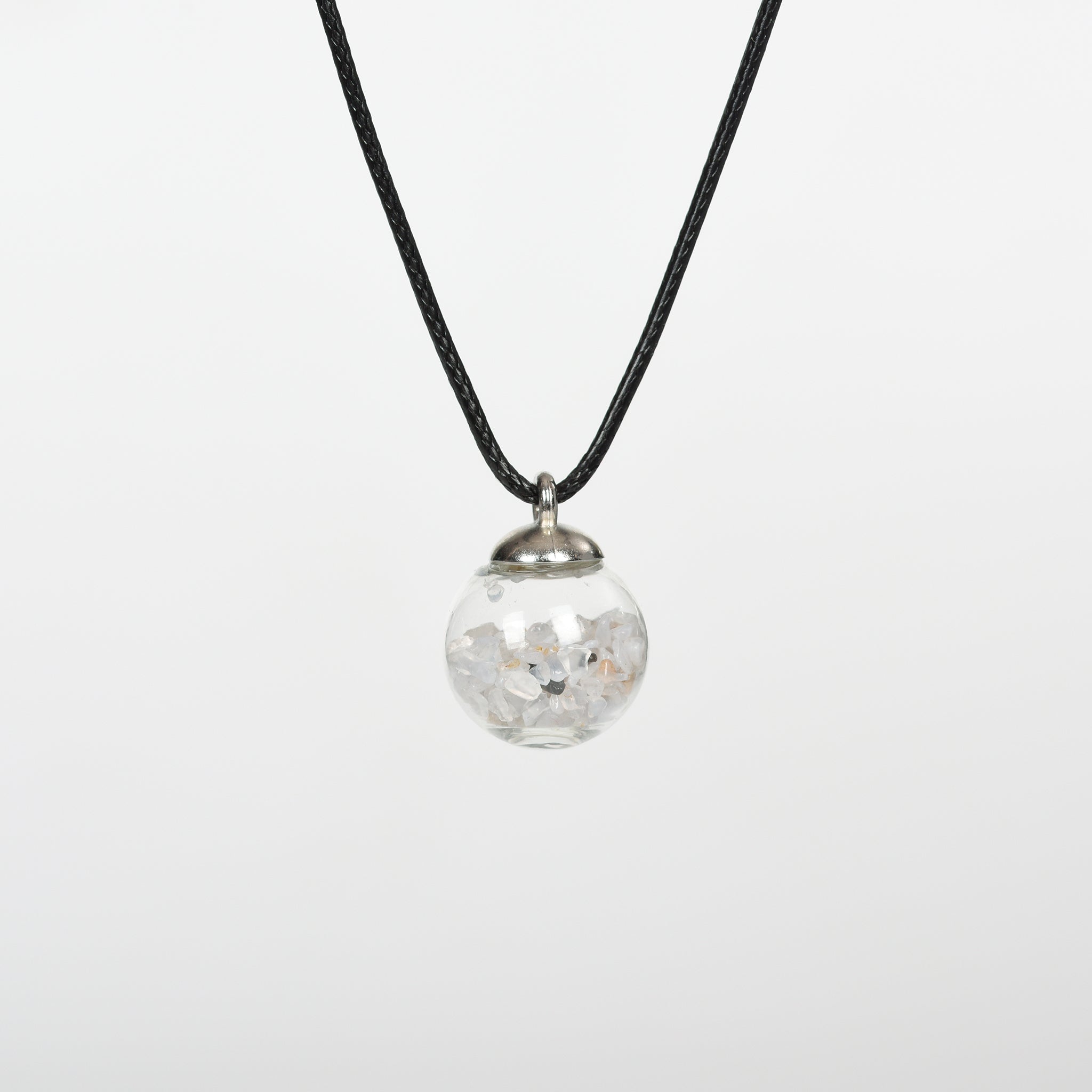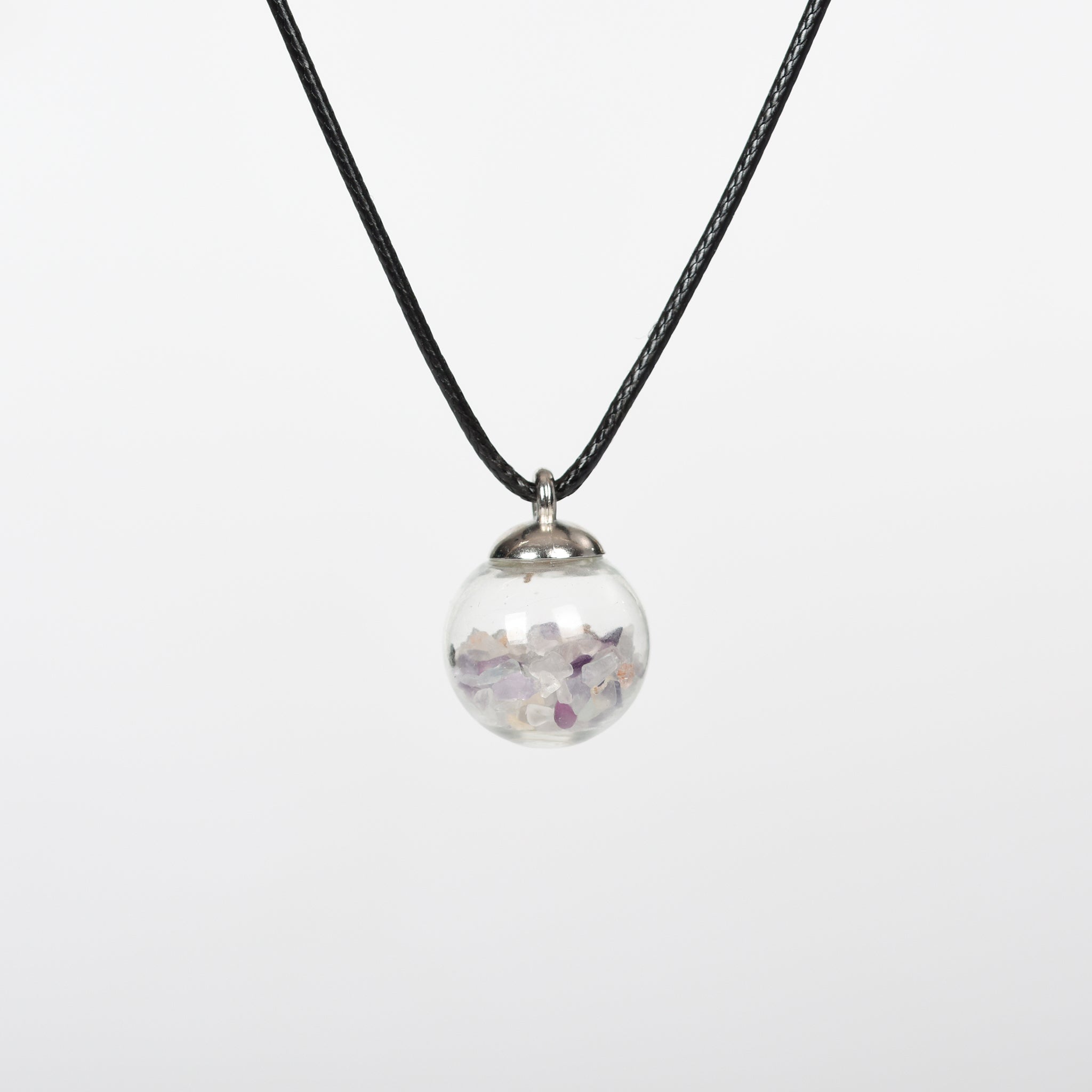 This elegant pendant necklace features a glass sphere filled with finely polished crystal chips, offering both a modern look and the timeless beauty of natural stones. Each glass ball is filled with unique gemstone chips such as rose quartz, black obsidian, tiger's eye, and more. The spherical design and the variety of stones make this pendant perfect for both casual and formal wear, while also harnessing the healing properties of the crystals within. Suspended on a sleek cord, this piece is not only a fashionable accessory but also a meaningful talisman.