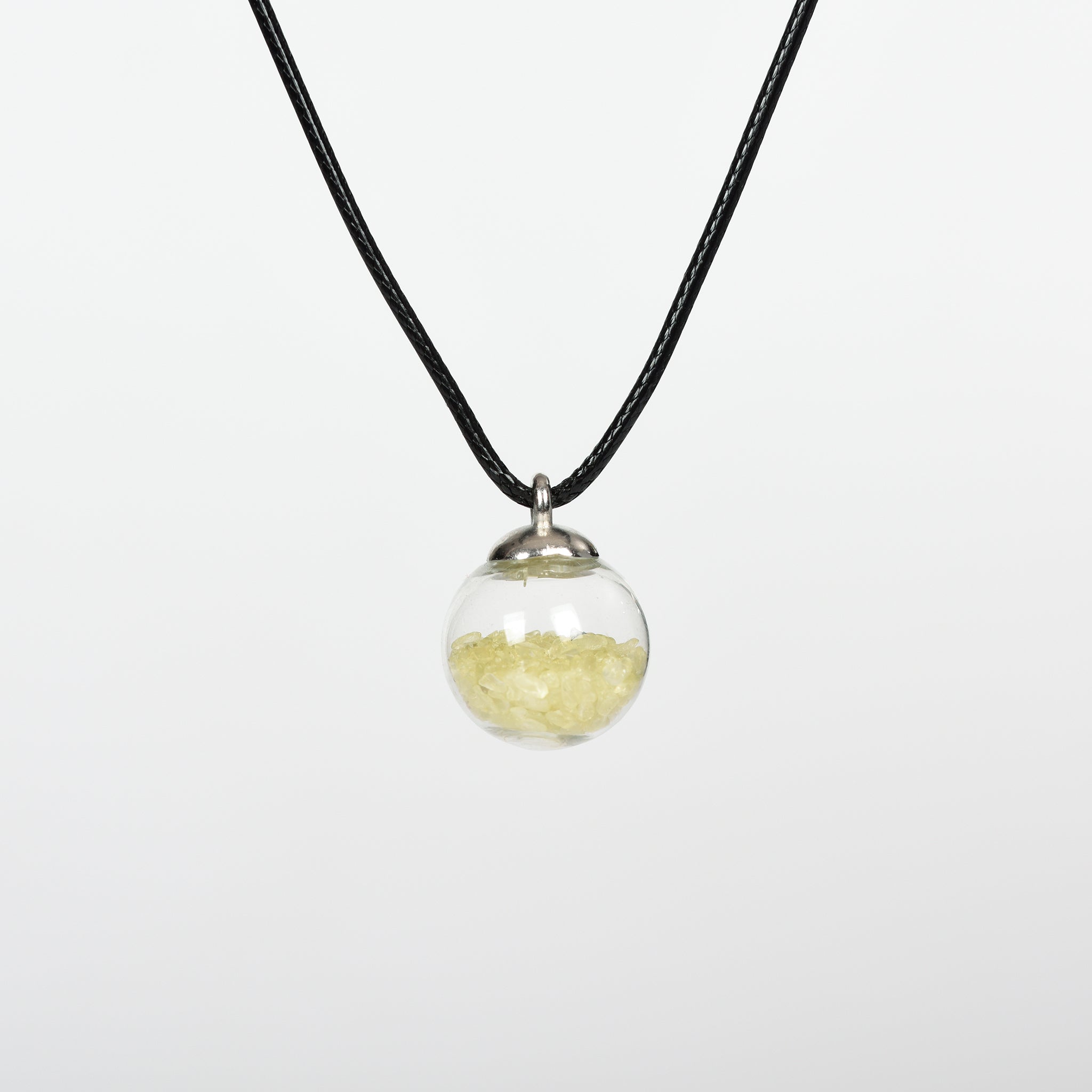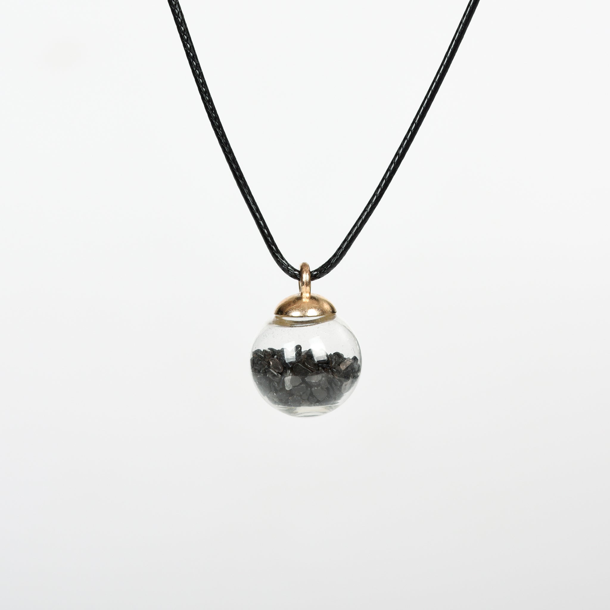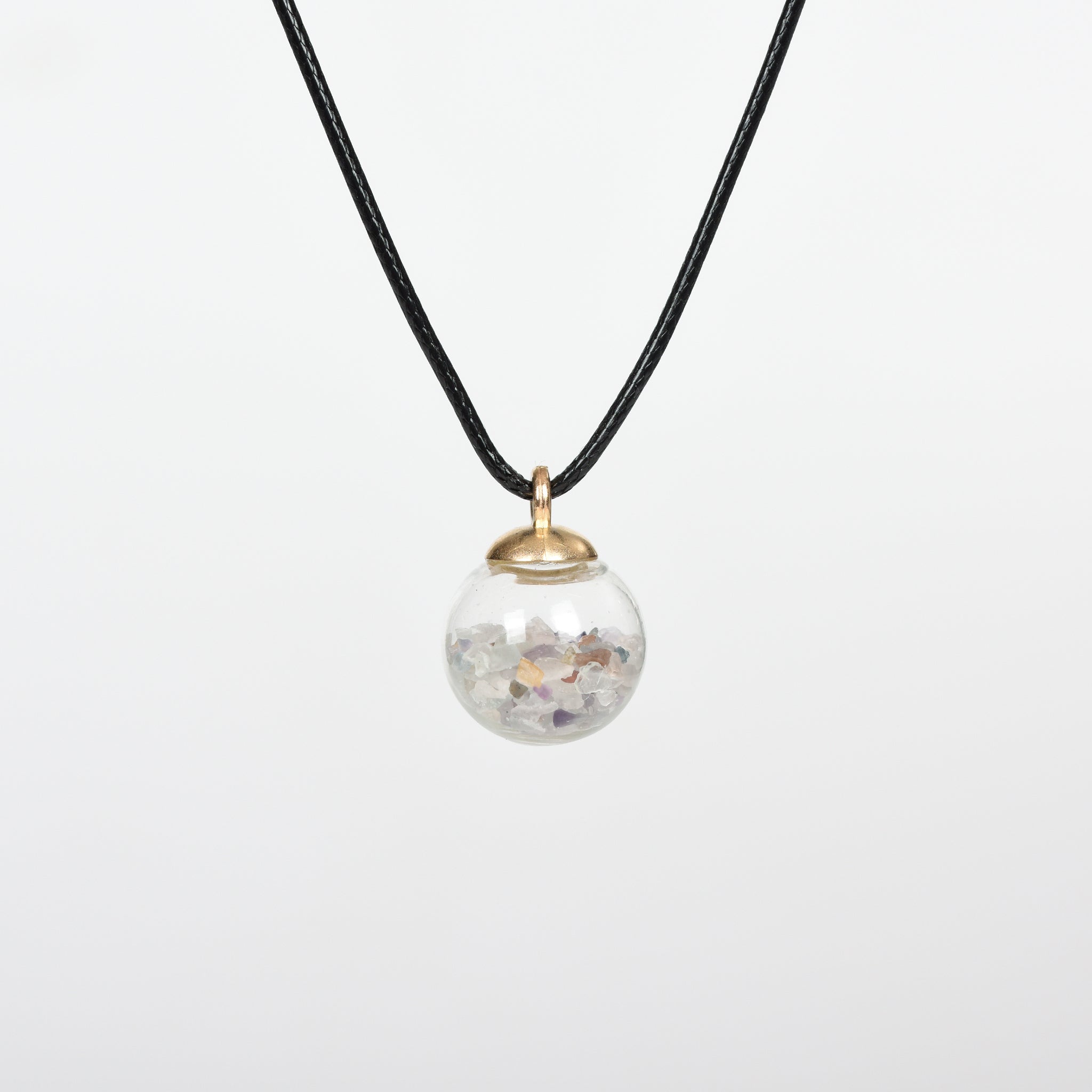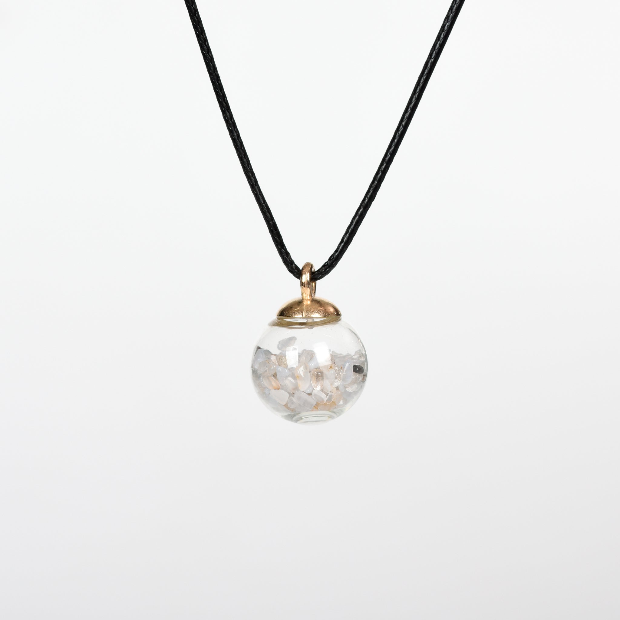 This elegant pendant necklace features a glass sphere filled with finely polished crystal chips, offering both a modern look and the timeless beauty of natural stones. Each glass ball is filled with unique gemstone chips such as rose quartz, black obsidian, tiger's eye, and more. The spherical design and the variety of stones make this pendant perfect for both casual and formal wear, while also harnessing the healing properties of the crystals within. Suspended on a sleek cord, this piece is not only a fashionable accessory but also a meaningful talisman.