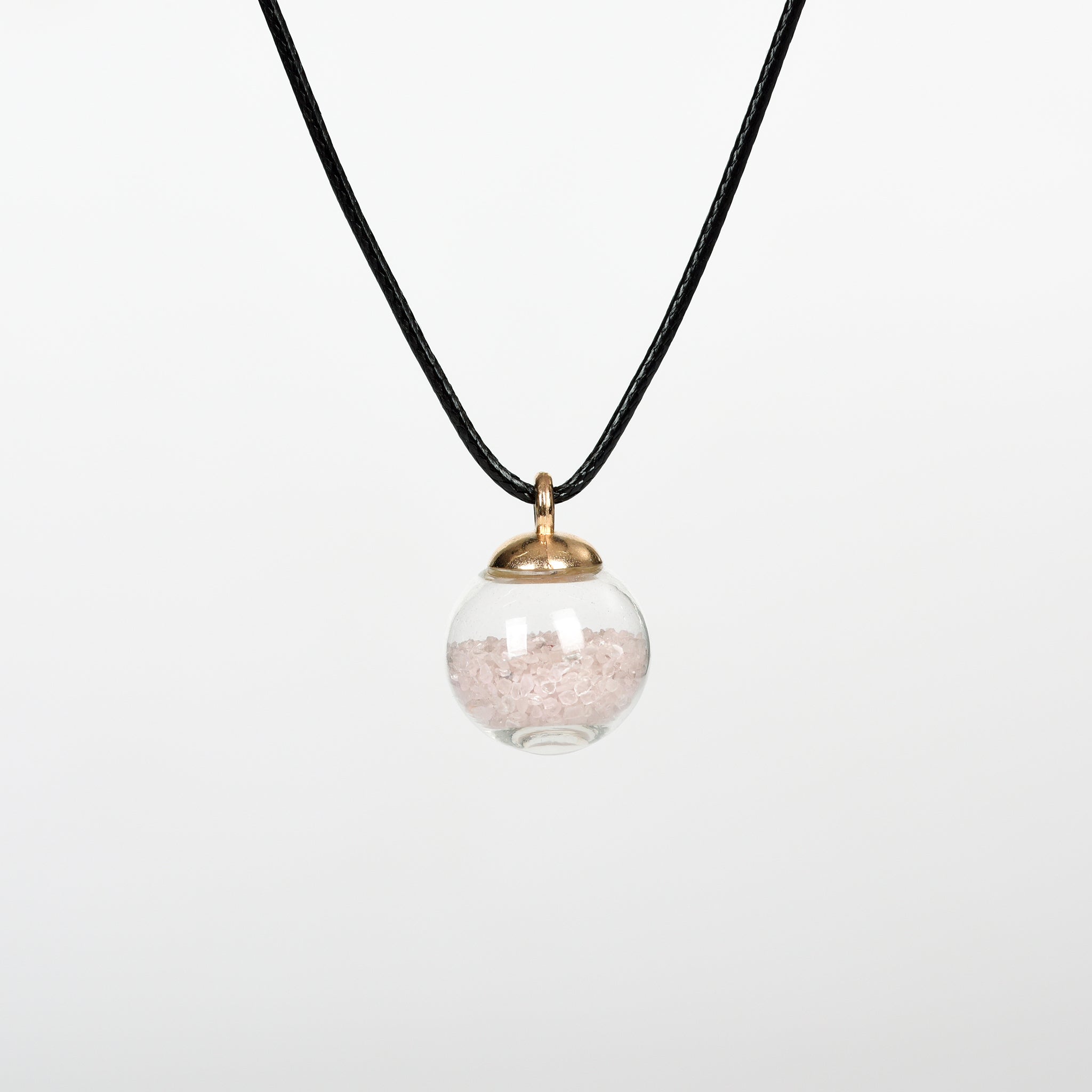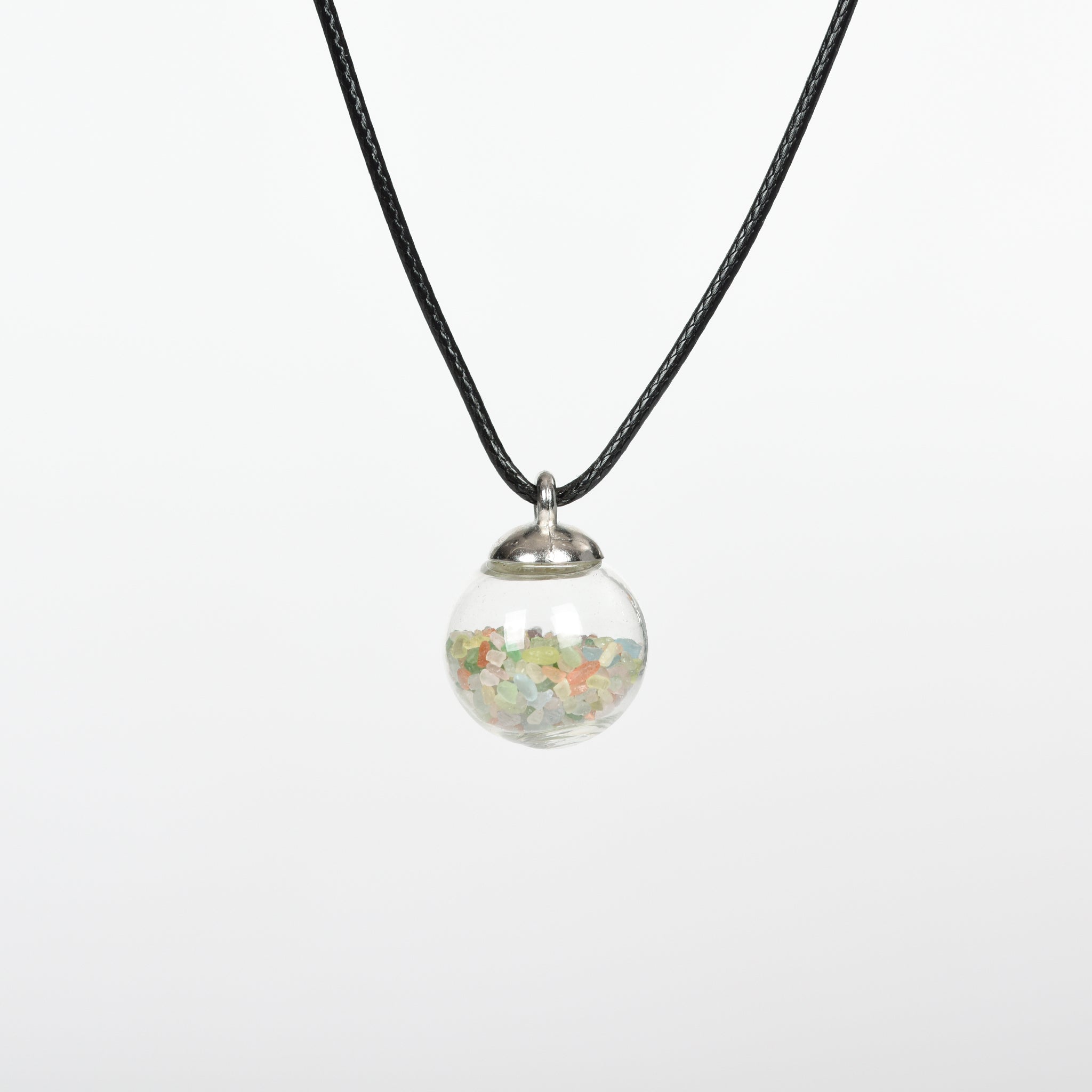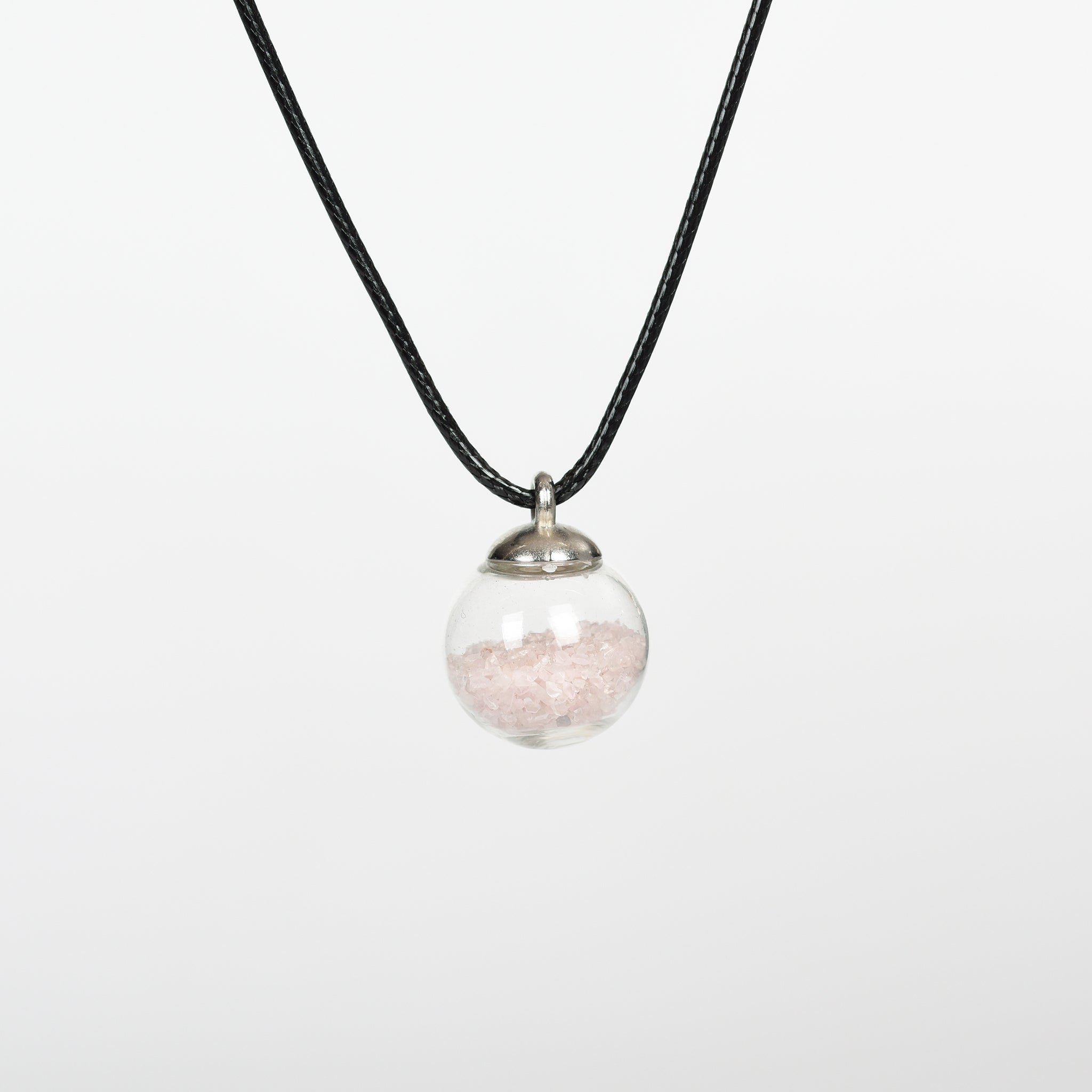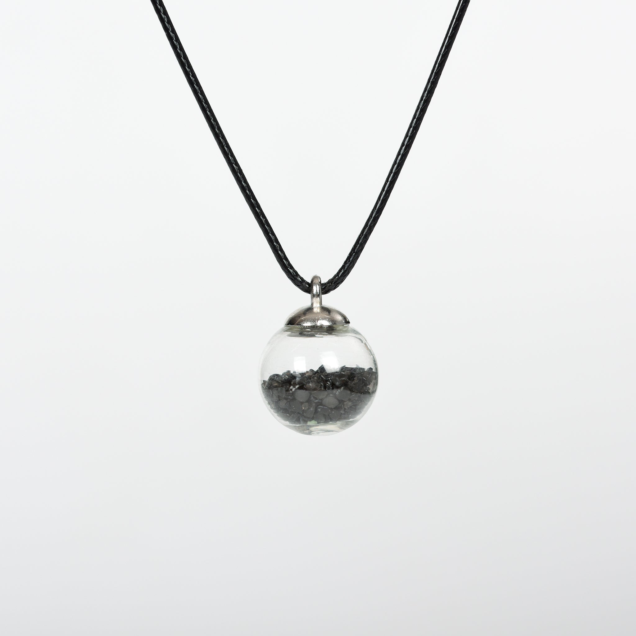 This elegant pendant necklace features a glass sphere filled with finely polished crystal chips, offering both a modern look and the timeless beauty of natural stones. Each glass ball is filled with unique gemstone chips such as rose quartz, black obsidian, tiger's eye, and more. The spherical design and the variety of stones make this pendant perfect for both casual and formal wear, while also harnessing the healing properties of the crystals within. Suspended on a sleek cord, this piece is not only a fashionable accessory but also a meaningful talisman.