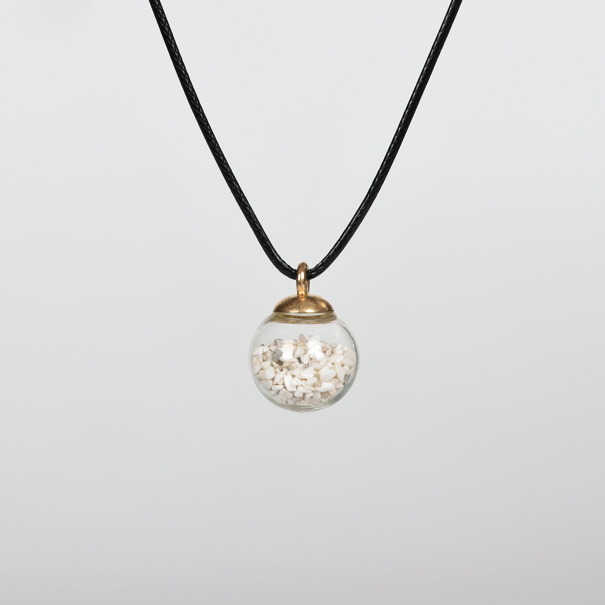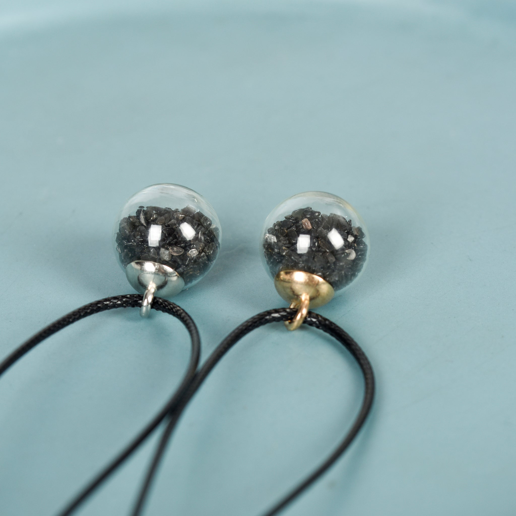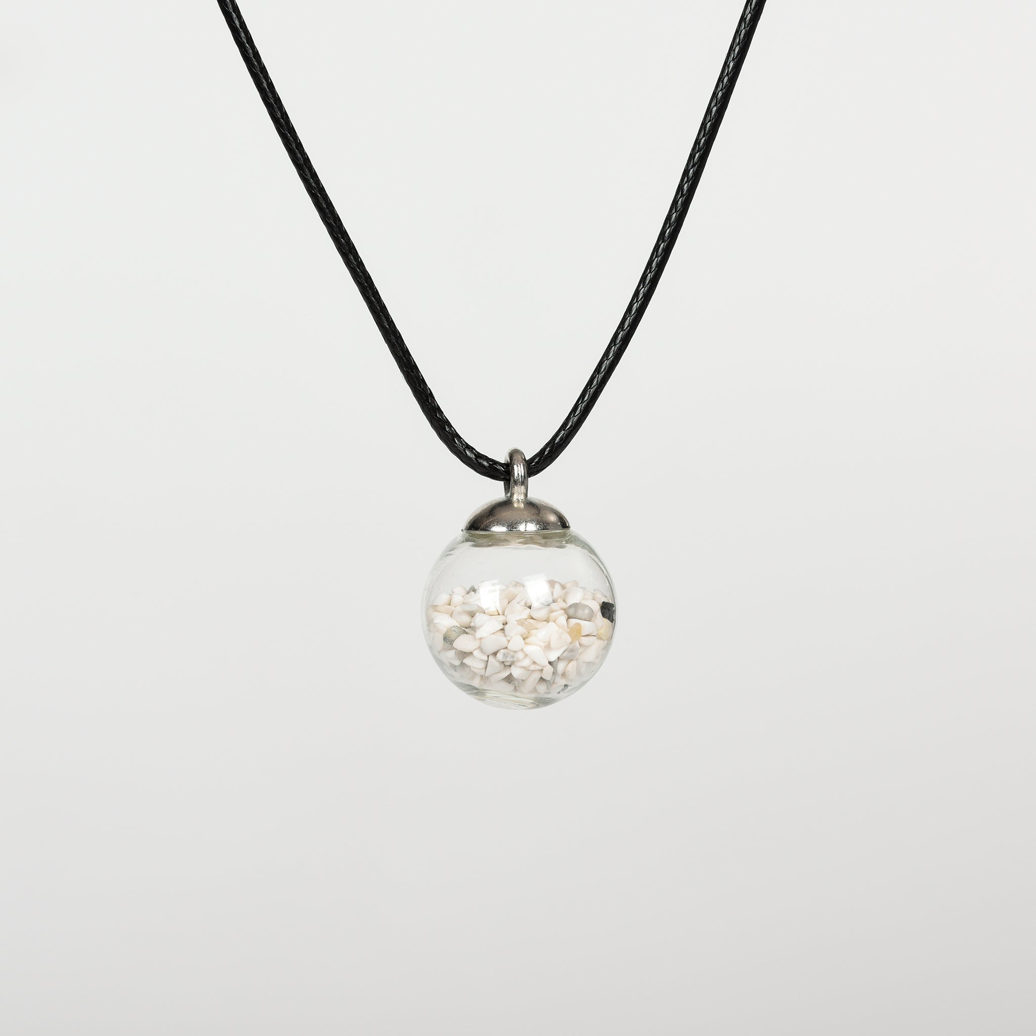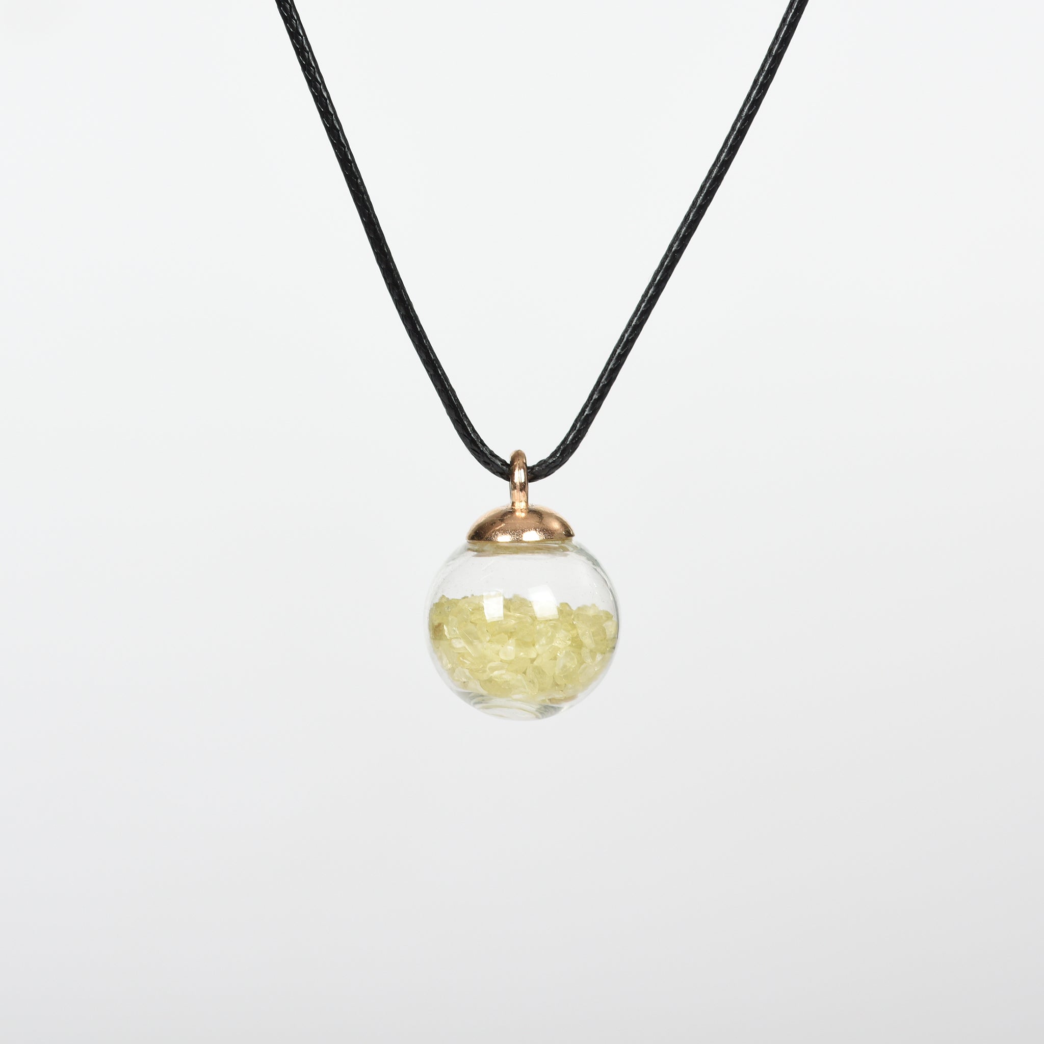 This elegant pendant necklace features a glass sphere filled with finely polished crystal chips, offering both a modern look and the timeless beauty of natural stones. Each glass ball is filled with unique gemstone chips such as rose quartz, black obsidian, tiger's eye, and more. The spherical design and the variety of stones make this pendant perfect for both casual and formal wear, while also harnessing the healing properties of the crystals within. Suspended on a sleek cord, this piece is not only a fashionable accessory but also a meaningful talisman.