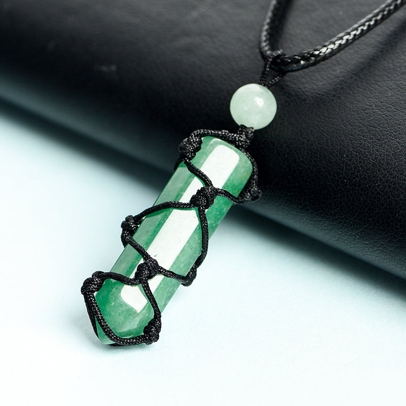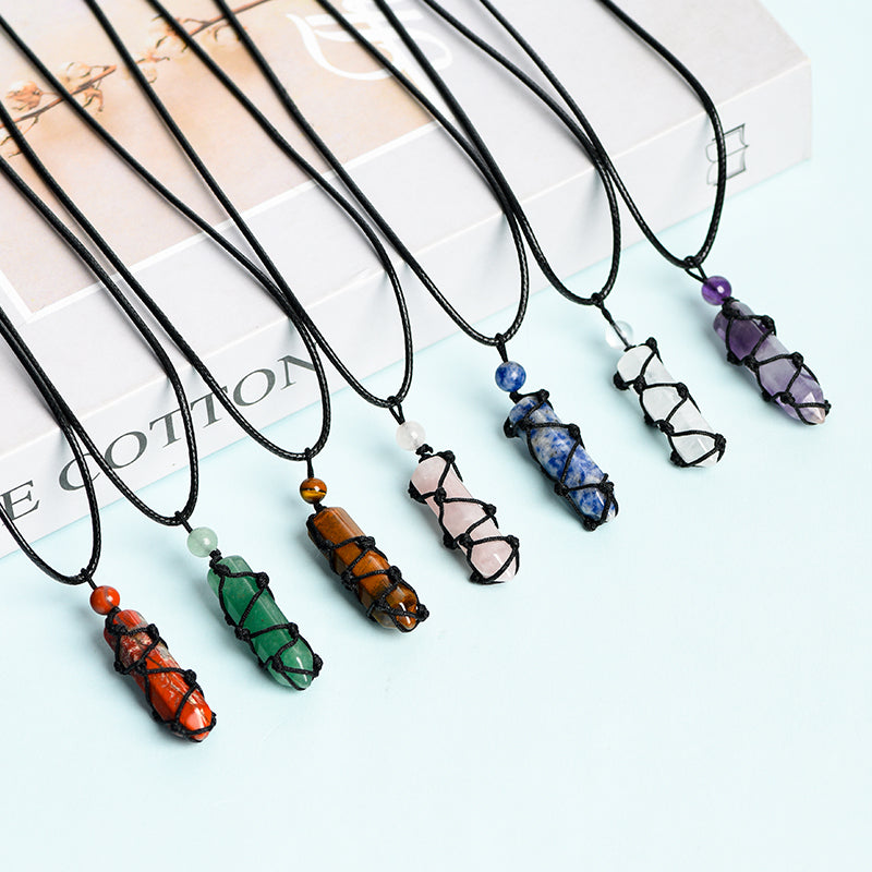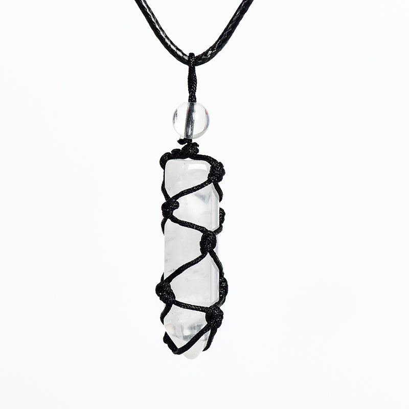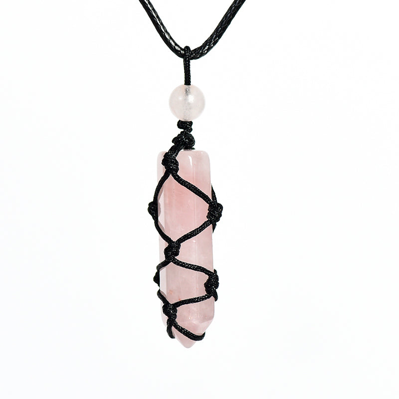 This striking pendant features a natural hexagonal crystal point, intricately wrapped in a handwoven cord, combining natural beauty with skilled craftsmanship. Each crystal point is terminated at both ends, representing focused energy, perfect for grounding and directing healing intentions. The handwoven net design securely holds the crystal while adding a touch of artistry to the piece. Available in various crystals like green aventurine, tiger’s eye, rose quartz, and more, this pendant is ideal for those who seek to harness the power of crystals in their everyday lives.
